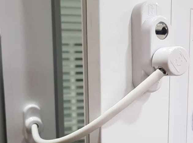 · Замки с тросом от выпадения детей из окон. По принципу работы напоминают цепочку для двери, а внешне похожи на велосипедный замок. С помощью ключа можно снять трос и открыть окно.